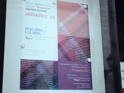 No 19. oktobra Kultūras un tautas mākslas centrā “Ritums” apskatāma Tautas lietišķās mākslas studijas “Draudzība” 65 gadu jubilejas izstāde “Krāsainie 65”.