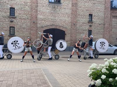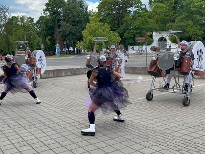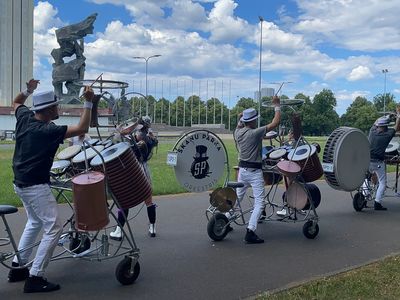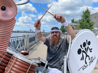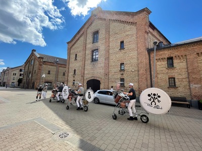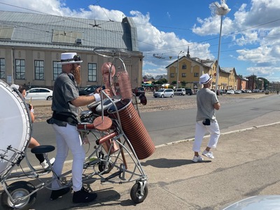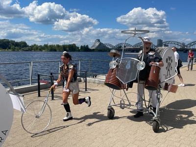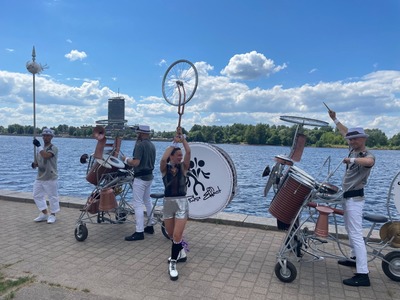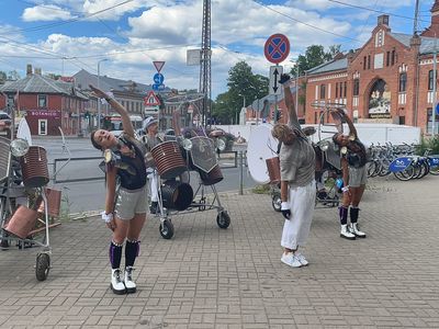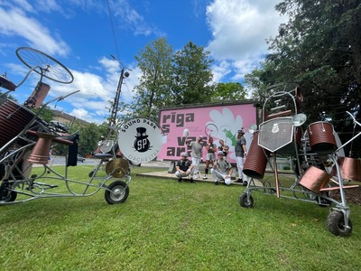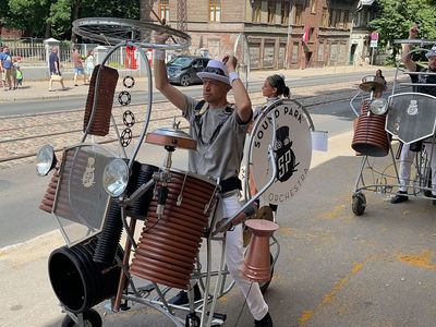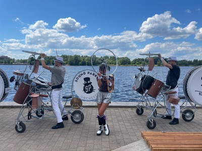 Mūzikas pop-up gājiens “Skaņu parka orķestris iziet Rīgas ielās” ir unikāls visā Baltijā savā vizuālajā izskatā un muzikālajā sniegumā – orķestra tehniskais pamats ir īpašas, šim nolūkam projektētas trīs vieglmetāla konstrukcijas, lai trīsritenim vai pajūgam līdzīgā konstrukcijā varētu sniegt muzikālu priekšnesumu, par instrumentiem izmantojot gan speciāli veidotas bungas, gan dažādus metāliskus priekšmetus, kā riteņa spieķus, zvaniņus, lejkannas u.c. instrumentus.