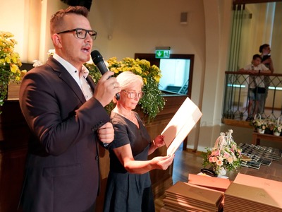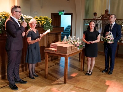 Svinīgajā pasākumā piedalījās un uzrunas teica Rīgas domes priekšsēdētāja vietniece Linda Ozola; video uzrunā jubilārus sveica Rīgas domes priekšsēdētājs Mārtiņš Staķis. Godpilnus vārdus jubilāriem veltīja arī Rīgas pilsētas dzimtsarakstu nodaļas vadītāja Ina Lutkevica.