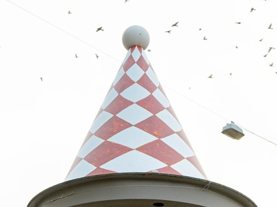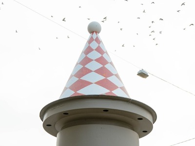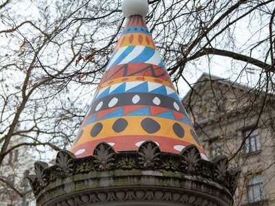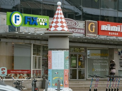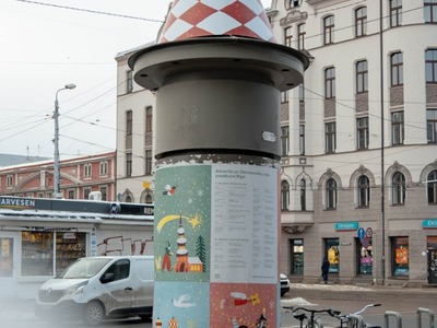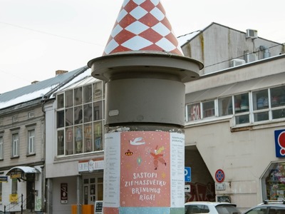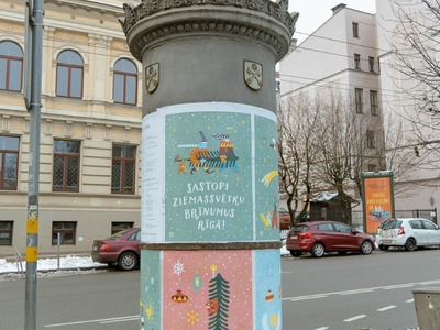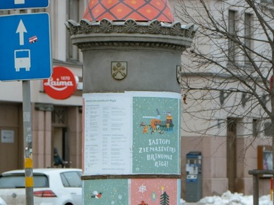 Ziemassvētku cepures uz pilsētas afišu stabiem