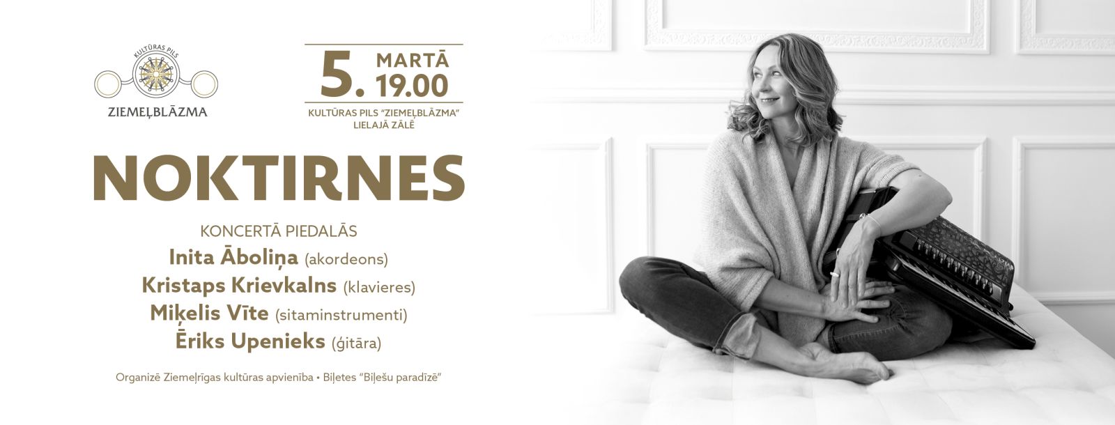 2026. gada 5. martā plkst. 19.00 Kultūras pils “Ziemeļblāzma” Lielajā zālē izskanēs akordeonistes Initas Āboliņas koncertprogramma “Noktirnes” - muzikāls stāsts akordeona balsī par skaistākajām latviešu dziesmām jaunās, negaidītās versijās.