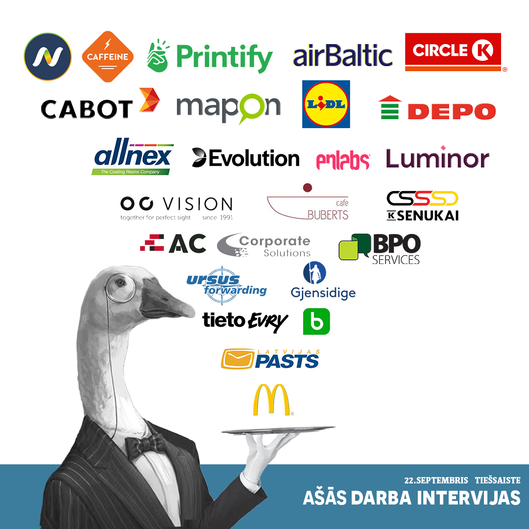 Darba meklētājiem tiks dota iespēja individuāli tikties ar pārstāvjiem gan no Latvijā plaši pazīstamiem uzņēmumiem – Cabot Corporation, airBaltic, Luminor, TietoEVRY, Caffeine, Mapon, Printify, allnex, Bite, Ursus Forwarding, DEPO, Kafejnīca Buberts, Latvijas Pasts, – gan arī starptautiskiem uzņēmumiem – Circle K, Lidl, Corporate Solutions, KESKO SENUKAI, Gjensidige, Enlabs, Premier Restaurants, Albert Cliff, OC VISION, Evolution Latvia, BPO Services un citiem lieliskiem darba devējiem.
