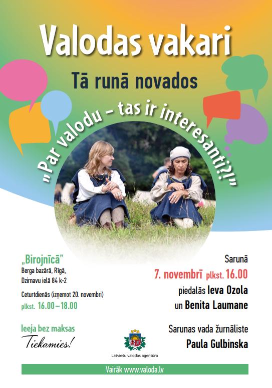 Latviešu valodas aģentūra turpina Valodas vakaru ciklu „Par valodu – tas ir interesanti?!”, kurā savus valodas stāstus atklāj valodnieki. 7. novembra Valodas vakarā turpināsim sarunu par latviešu valodas bagātību novados. Īpašu uzmanību veltīsim Lejaskurzemes izloksnei, gramatikai, neparastajiem mājvārdiem un uzvārdiem, kuru izcelsme dažkārt ir mīkla pašiem pētniekiem.