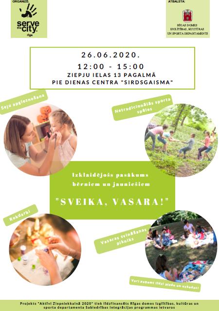 2020. gada 26. jūnijā no plkst. 12.00 līdz 15.00 Ziepju ielas 1 pagalmā pie Dienas centra “Sirdsgaisma”, notiks izklaidējošs pasākums bērniem un jauniešiem “Sveika, vasara!”.