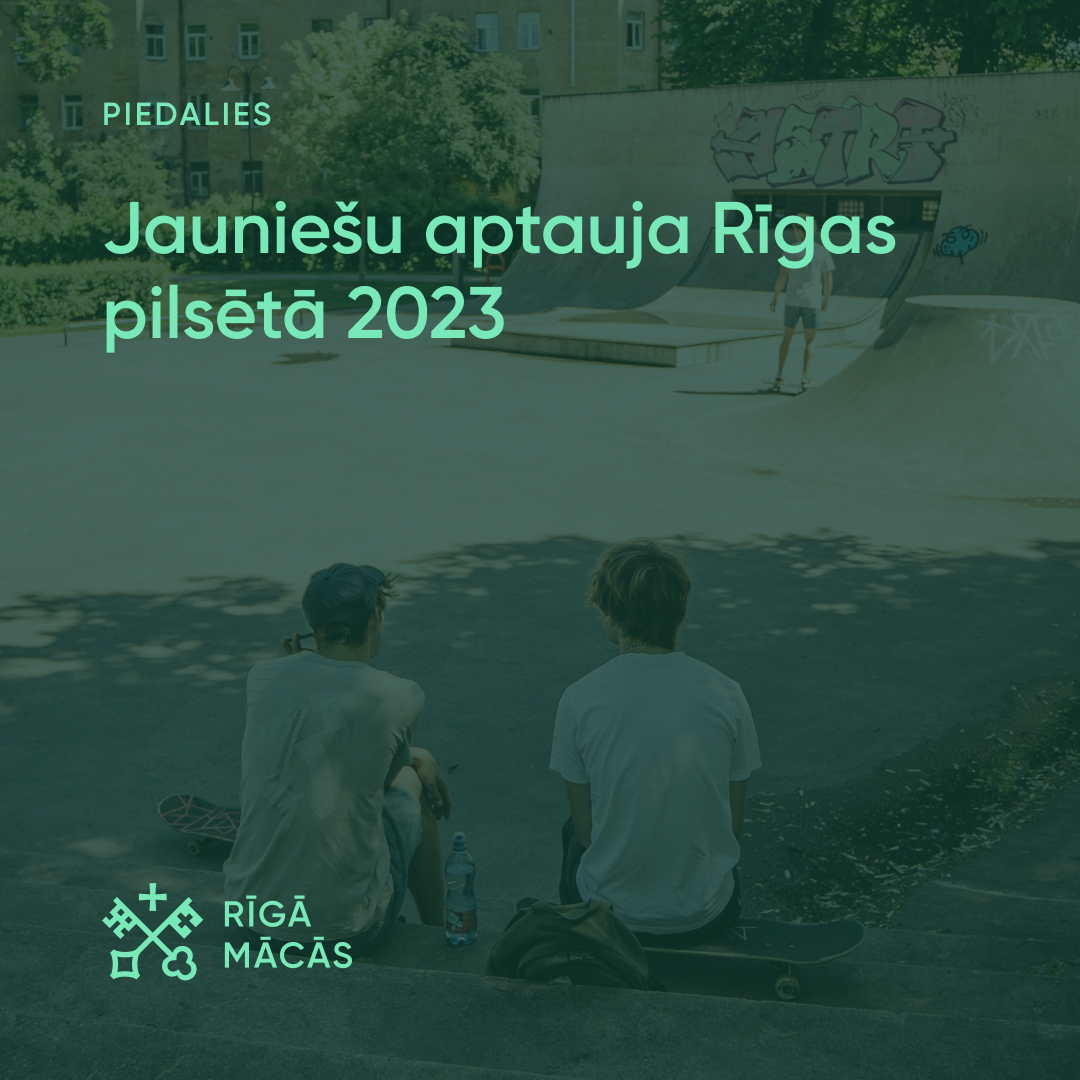 Rīgas domes Izglītības, kultūras un sporta departaments aicina jauniešus vecumā no 13 līdz 25 gadiem piedalīties aptaujā “Jauniešu aptauja Rīgas pilsētā 2023”, kuras mērķis ir uzlabot izpratni par Rīgas jauniešu interesēm, vajadzībām un iespējām. Aptauja paredzēta ne vien tiem jauniešiem, kas dzīvo Rīgā, bet arī tiem, kas Rīgā regulāri uzturas – mācās, strādā vai pavada šeit savu brīvo laiku.