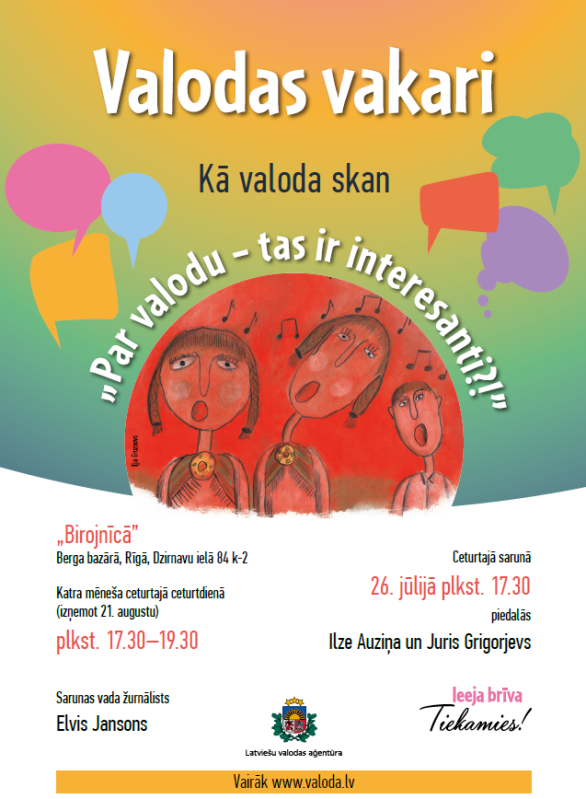 Latviešu valodas aģentūra 26. jūlijā Birojnīcā (Berga bazārā, Dzirnavu ielā 84 k-2) turpina ikmēneša sarunu ciklu „Par valodu – tas ir interesanti?!”. Katra mēneša ceturtajā ceturtdienā notiek diskusijas par valodas lomu un vietu sabiedrībā.