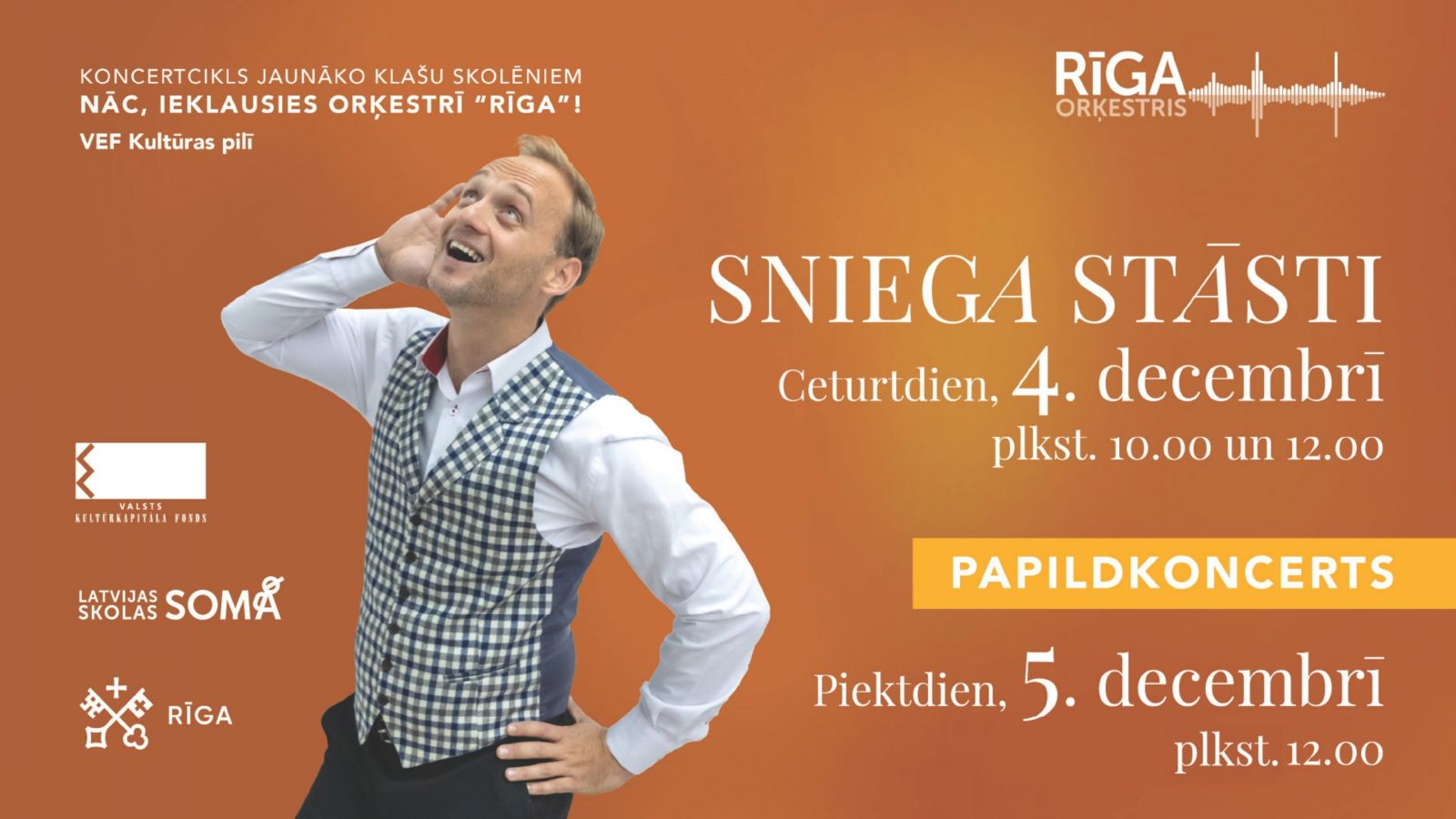 Ziemassvētku koncertā “Sniega stāsti” 4. decembrī plkst. 10.00 un 12.00 un papildkoncertā 5. decembrī plkst. 12.00, Orķestris “Rīga” un Daumants Kalniņš svētku noskaņu uzburs kopā ar īpašiem viesiem – dziedātāju Anniju Putniņu un bērnu vokālo ansambli “Momo”. Skolēni muzikālās sarunās uzzinās, kā veidojas sniegs, kāpēc tas ir balts un ko vēsta sniega gurkstēšana. Koncertā skanēs iemīļotas dziesmas “Svētki ledus pilī”, “Laba slava sniedziņam”, “Zvaniņš skan”, kā arī Pētera Čaikovska “Saldumu fejas deja” no baleta “Riekstkodis” un Valta Pūces “Klusa un svēta nakts”.