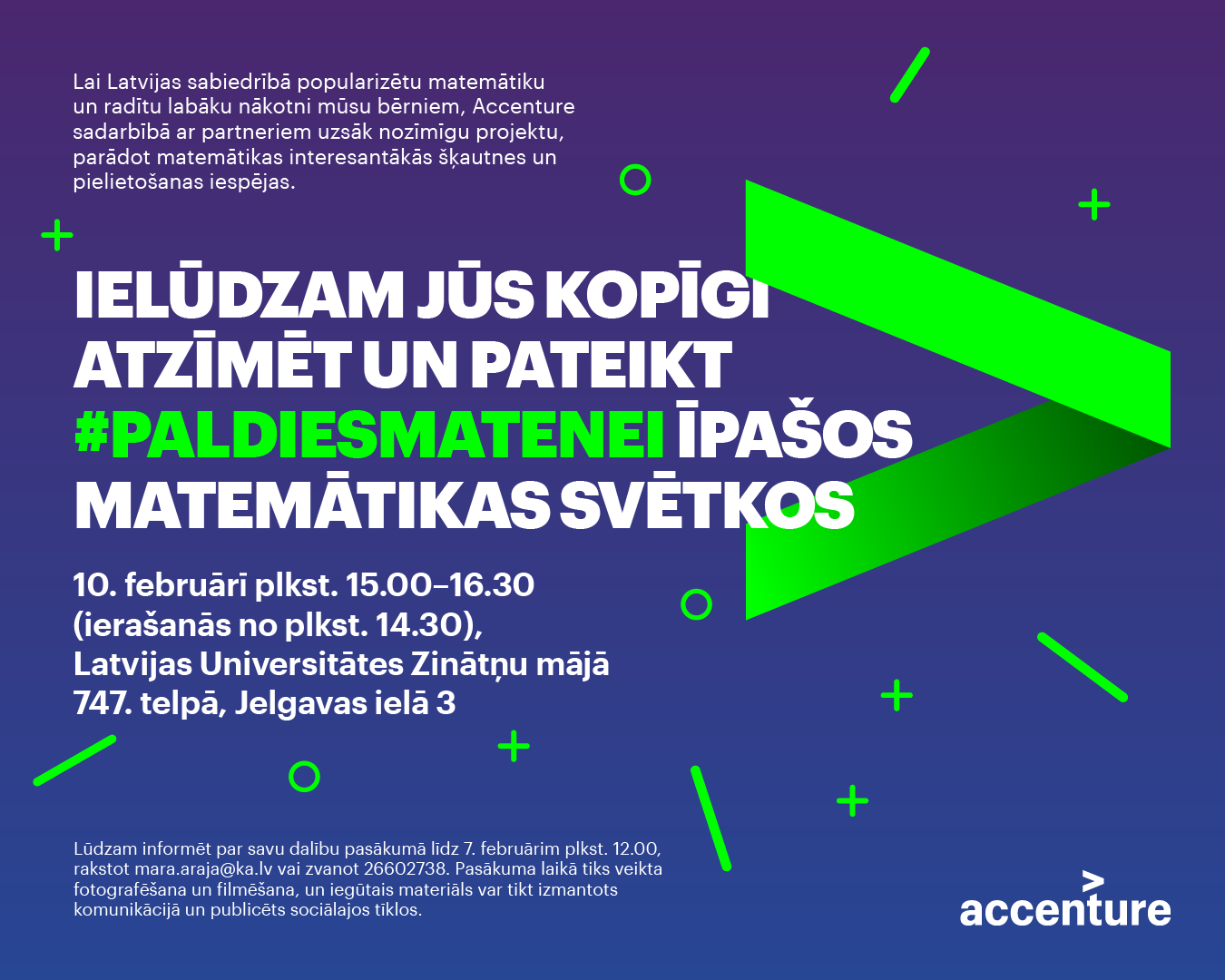 10. februārī plkst. 15.00 Latvijas Universitātes Zinātņu mājā (Jelgavas ielā 3) 747. telpā Accenture sadarbībā ar partneriem aicina matemātikas skolotājus piedalīties “Matemātikas svētkos”.