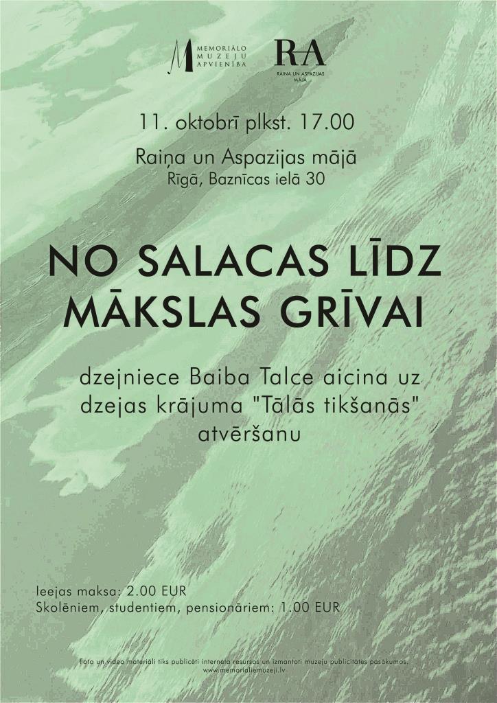 11. oktobrī, plkst. 17.00, Rīgā, Raiņa un Aspazijas mājā, Baznīcas ielā 30 dzejniece Baiba Talce aicina uz dzejas krājuma "Tālās tikšanās" atvēršanu.