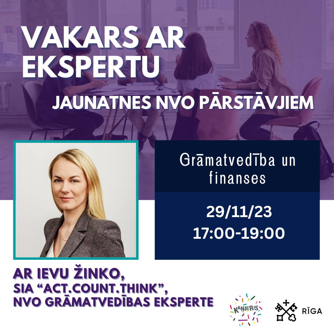 Jaunatnes nevalstisko organizāciju un jomas pārstāvji aicināti tikties ar grāmatvedības eksperti Ievu Žinko (SIA “act.count.think”) un brīvā gaistonē pārrunāt sev aktuālos jautājumus par grāmatvedību un finanšu pārvaldību jaunatnes nevalstiskajās organizācijās (t.sk. NVO, kas veic darbu ar jauniešiem).