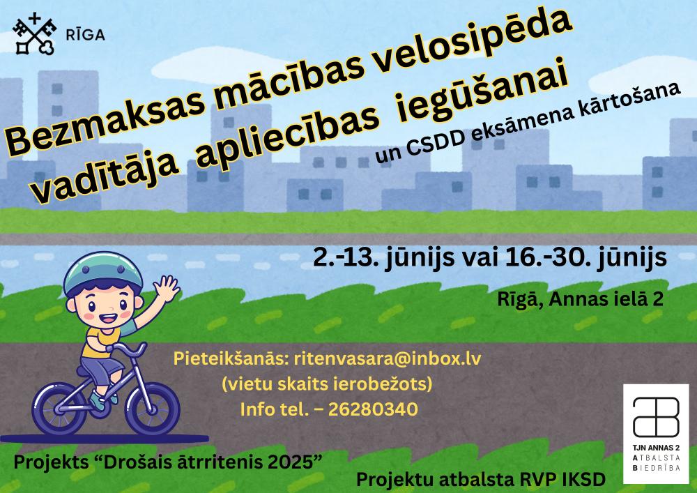 Ja Tev jau ir 10 gadi un gribi iegūt velosipēda vadītāja apliecību, piesakies Jaunā velovadītāja skolas bezmaksas mācībām projektā "Drošais ātrritenis 2025".
