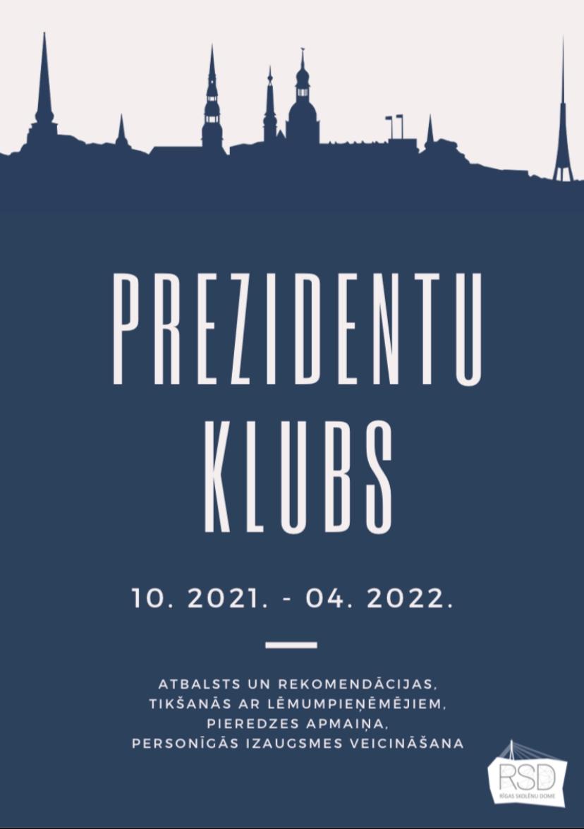 Tā šogad atsākās jau pirms vairākiem gadiem RSD organizēts Prezidentu Klubs, kas pulcē vienuviet Rīgas skolu skolēnu pašpārvalžu vadītājus. Šis ir apmācību cikls visa mācību gada garumā, kura laikā pašpārvalžu prezidentiem un viceprezidentiem būs iespēja tikties ar dažādu jomu pārstāvjiem un profesionāļiem, klausīties viņu pieredzē un izmēģināt savas prasmes strādājot komandā, kā arī veicināt savu personīgo izaugsmi. Bieži uz pašpārvaldei aktuāliem jautājumiem skolas vadība atbild ar: ‘’tas ir jārisina pilsētas līmenī’’ un problēma vairs netiek pacelta, Prezidentu Klubs ir vieta, kur kopīgiem spēkiem tiks risinātas pašpārvaldēm aktuālās problēmas pilsētas līmenī. Projekta laikā tiks izstrādāti mehānismi veiksmīgākai pašpārvaldes darbībai, kas noderēs arī nākamajiem vadītājiem. Projekts tapa ar mērķi veicināt komunikāciju pašpārvalžu starpā un veidot jaunas metodes tās efektivitātes palielināšanai. Šī gada laikā ar dalībniekiem plānots izveidot vienotu redzējumu par pašpārvalžu attīstību un tālejošiem mērķiem.