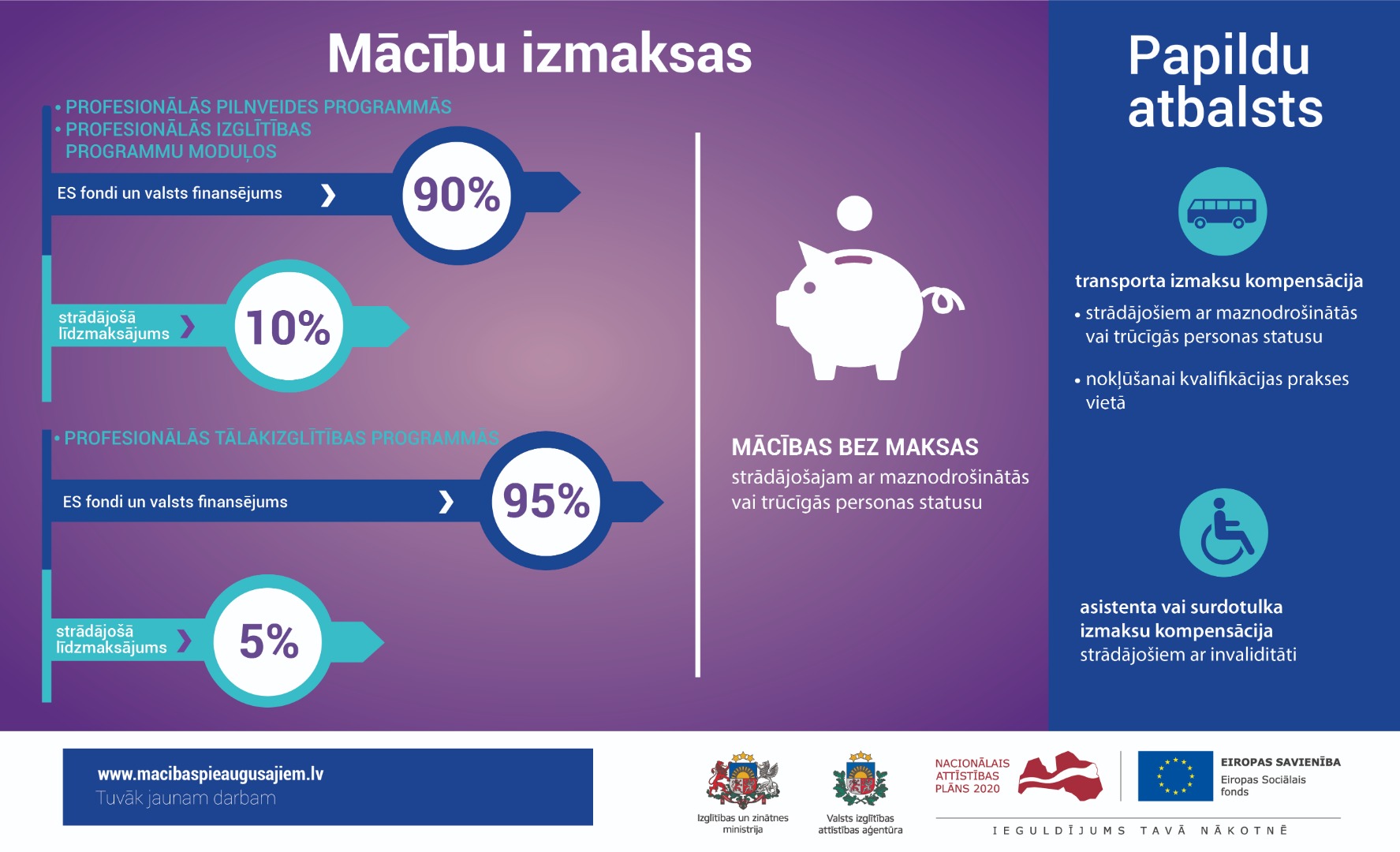 Sākot ar piekto pieteikšanās kārtu ir mainījušies līdzfinansējuma nosacījumi un, apgūstot kādu no profesionālās tālākizglītības programmām, kuru noslēgumā var iegūt profesiju, iedzīvotājiem būs jāmaksā tikai 5% līdzmaksājums, jo 95% sedz ES fondi un valsts. Turklāt pēc programmas apgūšanas iedzīvotājs varēs saņemt arī ceļa izdevumu kompensāciju līdz 30 eiro mēnesī, kas iztērēti, dodoties uz prakses vietu un atpakaļ. Pārējo izglītības programmu veidos iedzīvotāju līdzfinansējuma apjoms paliek nemainīgi 10%, ES fondu un valsts – 90%. Maznodrošinātajiem un trūcīgajiem mācības ir bez maksas, savukārt strādājošie ar invaliditāti var pretendēt uz asistenta vai surdotulka izmaksu kompensāciju mācību laikā.