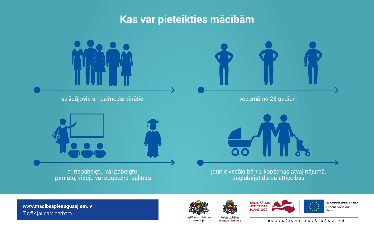 Mācībām var pieteikties strādājoši un pašnodarbināti iedzīvotāji vecumā no 25 gadiem līdz neierobežotam vecumam, tostarp jaunie vecāki bērna kopšanas atvaļinājumā, saglabājot darba attiecības, un strādājoši pensionāri. Katrs strādājošais projekta laikā var mācīties divas reizes neatkarīgi no pieteikšanās kārtu skaita, taču vienlaicīgi iespējams mācīties tika vienā izglītības programmā. Mācību grupu komplektēšana un mācības tiem, kas pieteiksies piektajā mācību kārtā, sāksies 2020. gada novembrī. Plašāka informācija par uzņemšanas nosacījumiem, mācību un atbalsta iespējām, kā arī visu mācību saraksts ir publicēts projekta tīmekļa vietnē www.macibaspieaugusajiem.lv.