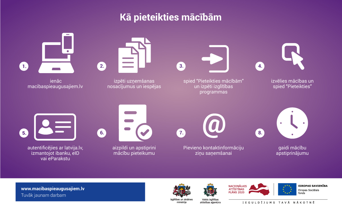 Tāpat kā iepriekš pieteikšanās mācībām norit tiešsaistē mājaslapā www.macibaspieaugusajiem.lv, izmantojot latvija.lv autentifikāciju un e-pakalpojumu jebkurā diennakts laikā.
