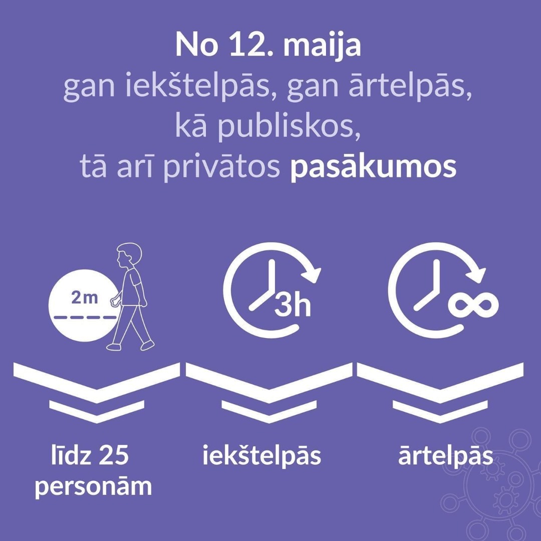 Ja iespējams nodrošināt savstarpējo divu metru distanci un pārējos epidemiologu noteiktos drošības noteikumus, tiks atļauta pulcēšanās iekštelpās un ārtelpās līdz 25 cilvēkiem organizētos publiskos un privātos pasākumos, kā arī sapulcēs, gājienos un piketos. Tāpat tiks atļauta organizēta reliģisko darbību veikšana. Arī privātos pasākumos mājās būs jāņem vērā dzīvokļa platība, lai nepārsniegtu cilvēku skaitu, kas atbilst epidemiologu norādījumiem.