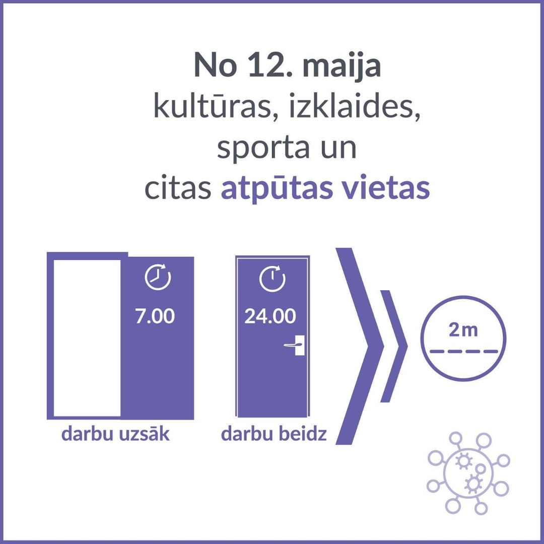 Pēc 12. maija tiek atļauts organizēt tūrisma pakalpojumus ceļošanai tikai Latvijā, Lietuvā un Igaunijā. 14 dienas pašizolācija dzīvesvietā neattieksies un Latvijas valstspiederīgajiem un pastāvīgajiem iedzīvotājiem, kā arī ārzemniekiem, kuri pēdējo 14 dienu laikā nav apmeklējuši valstis, kas nav Latvija, Lietuva vai Igaunija.