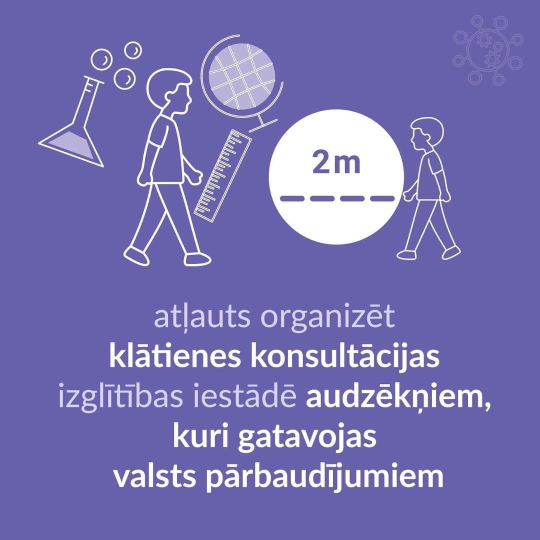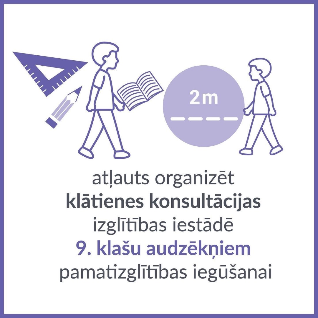 Ievērojot noteiktos fiziskās distancēšanas un epidemioloģiskās drošības pasākumus, tiks atļautas klātienes konsultācijas, lai sagatavotos valsts pārbaudījumiem vai profesionālās kvalifikācijas eksāmeniem. Lai gan 9. klašu skolēniem obligātie eksāmeni ir atcelti, arī viņiem konsultācijas klātienē būs atļautas.
