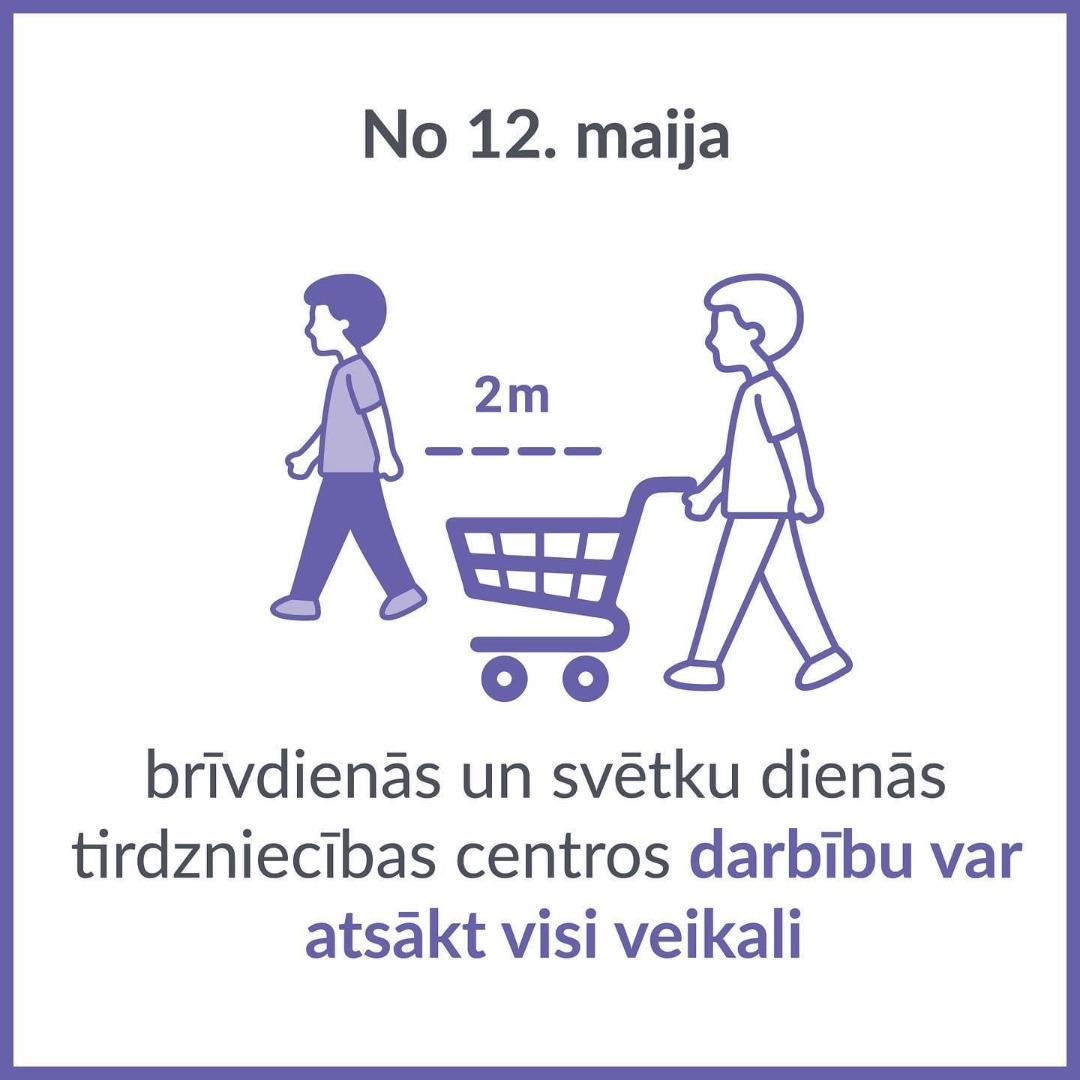 Turpmāk brīvdienās un svētku dienās tirdzniecības centros strādās visi veikali. Ir atcelts ierobežojums, ka tirdzniecības centros darbojas tikai pārtikas veikali, preses tirdzniecības vietas, aptiekas, vakcinācijas kabineti, optikas veikali, dzīvnieku barības veikali, ķīmiskās tīrītavas, higiēnas un saimniecības preču veikali, kā arī būvniecības un dārzkopības preču veikali.
