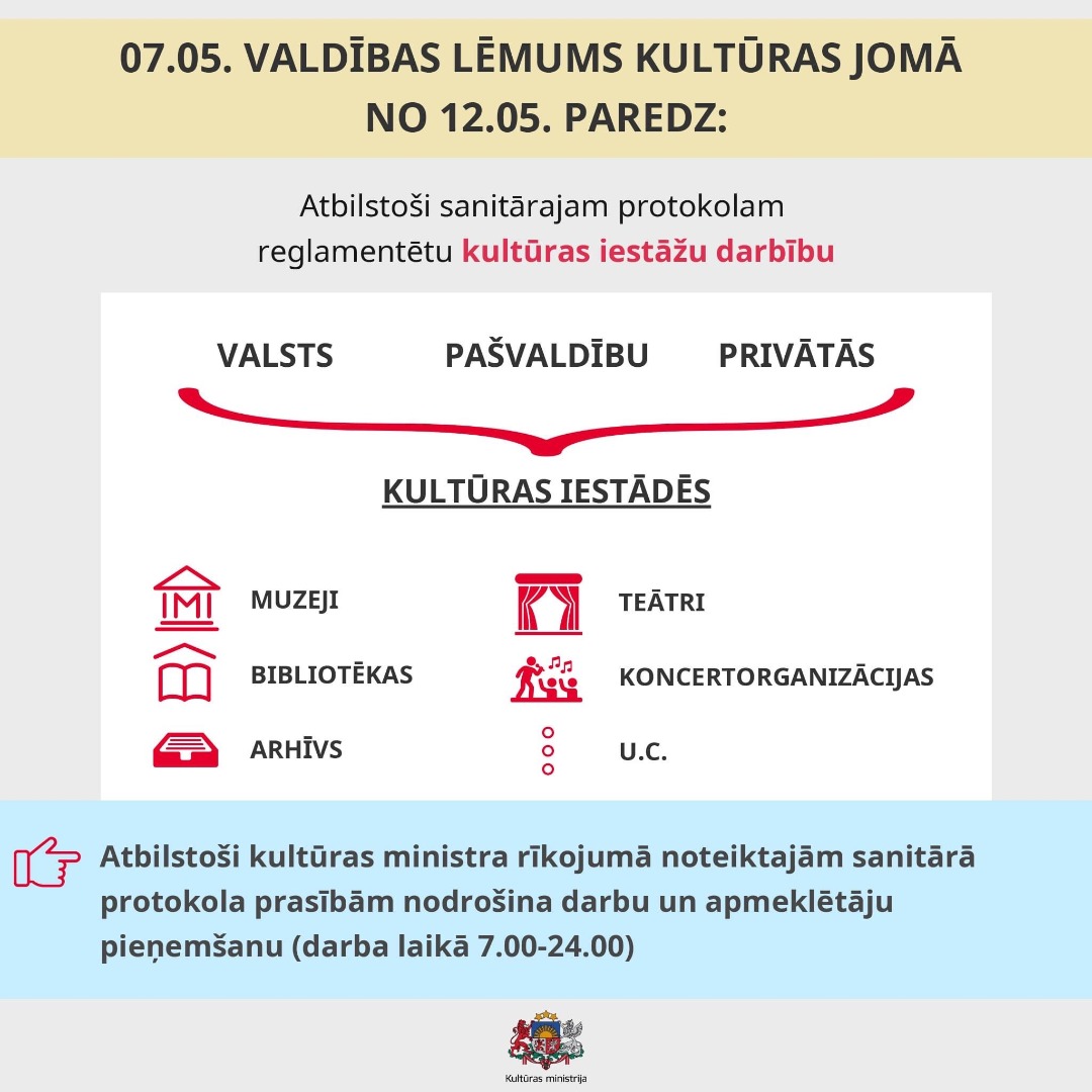 Savukārt kultūras ministram būs tiesības reglamentēt kārtību, kādā kultūras institūciju darbībā ievērojami fiziskās distancēšanās un dezinficēšanas prasību ievērošana kultūras institūcijās, piemēram, bibliotēkās, muzejos u. c. vietās.