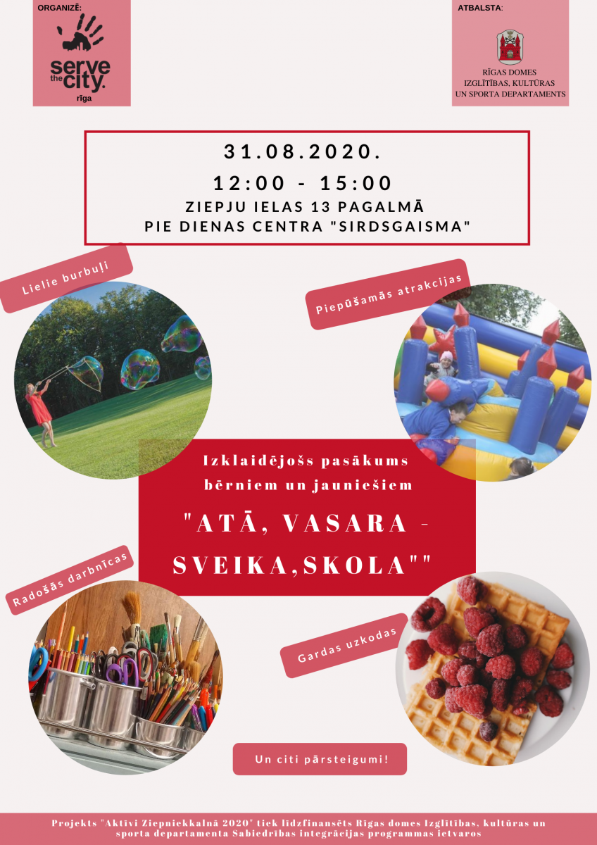 2020. gada 31. augustā no plkst. 12.00 līdz 15.00 Ziepju ielas 13 pagalmā pie dienas centra “Sirdsgaisma” notiks vasaras noslēguma ballīte "Atā, vasara - sveika, skola".